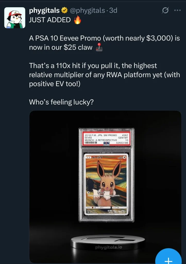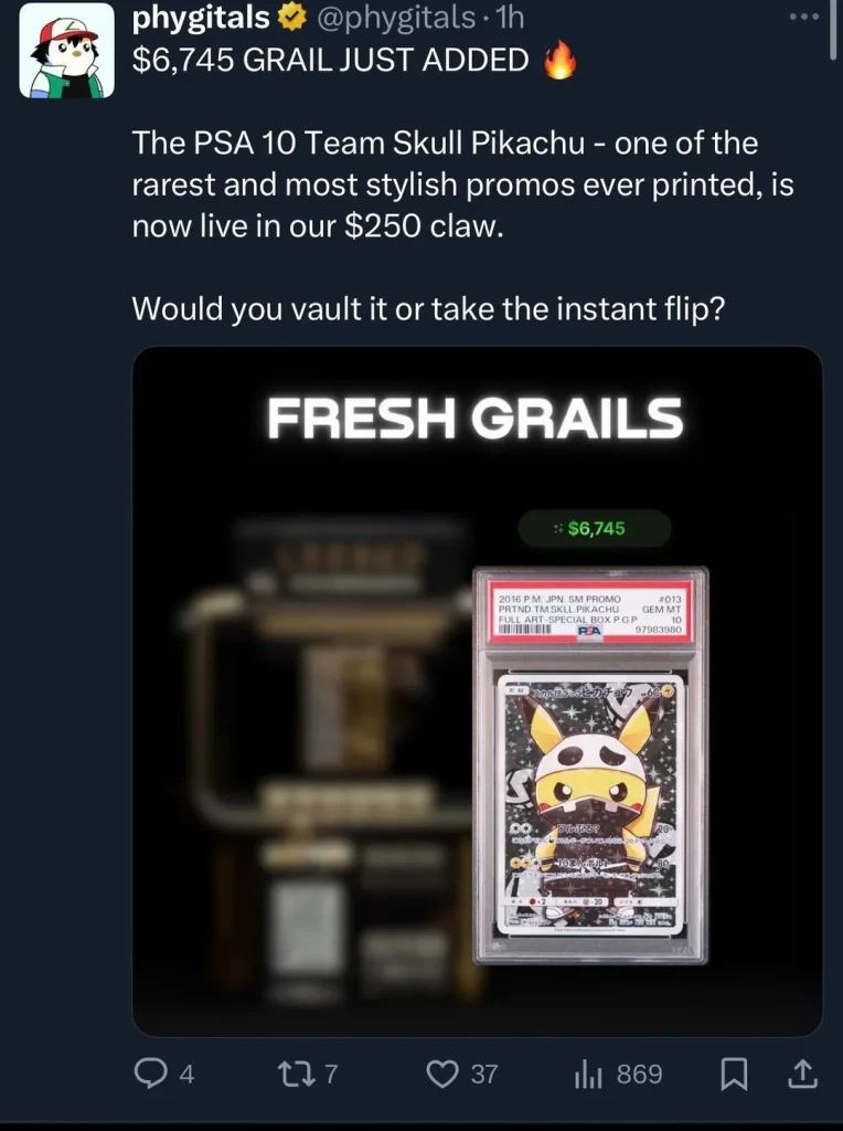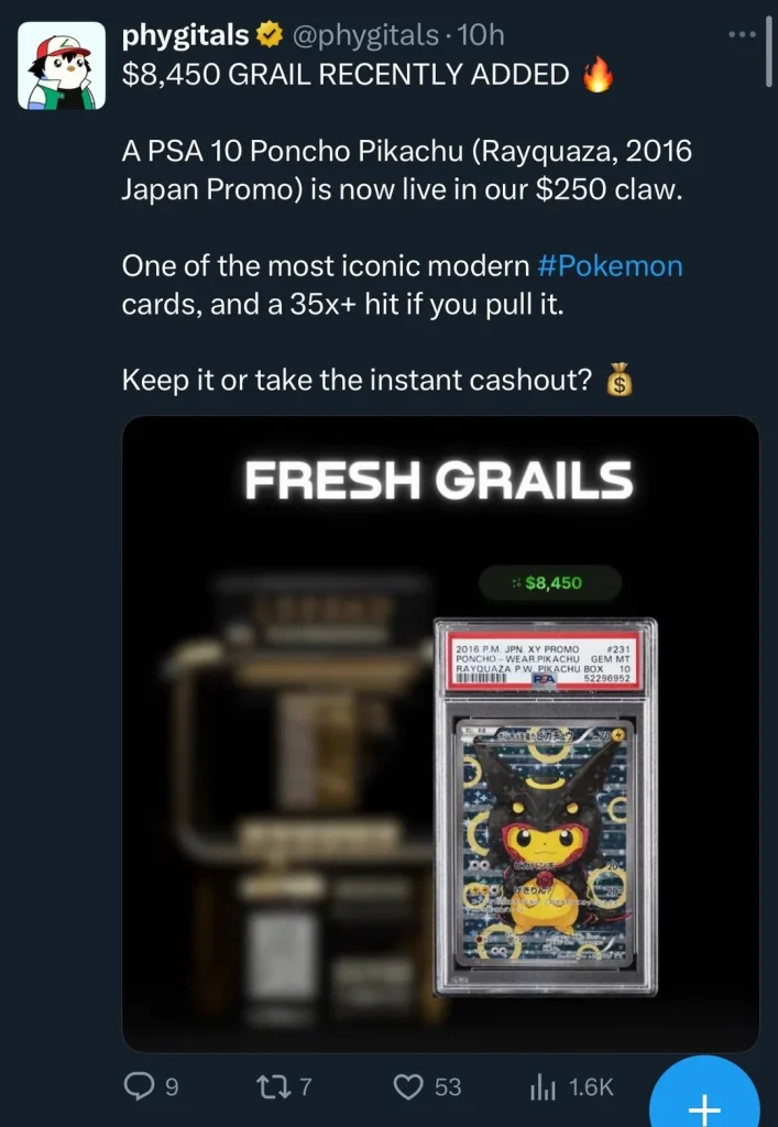 Just wanted to warn people about an experience I had with a company called Phygitals.com. They’re running a pokémon claw machine that show off massive graded Pokémon cards you can supposedly pull from their claw machines. Sounds amazing, right? Except… it’s completely misleading.